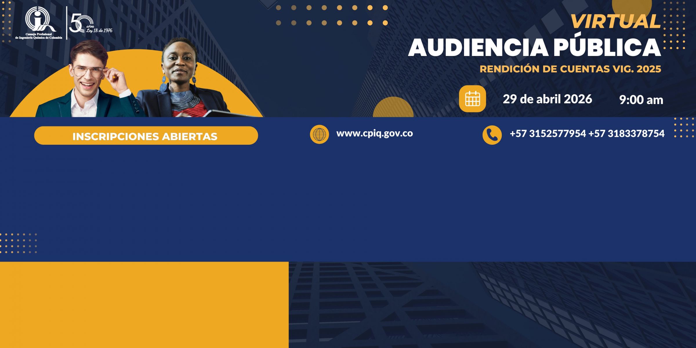 CPIQ 50 añosHoy se conmemoran 50 años de la Ley 18 de 1976, mediante la cual se creó el Consejo Profesional de Ingeniería Química de Colombia, entidad que ha trabajado por el ejercicio ético y legal de la profesión al servicio del país.